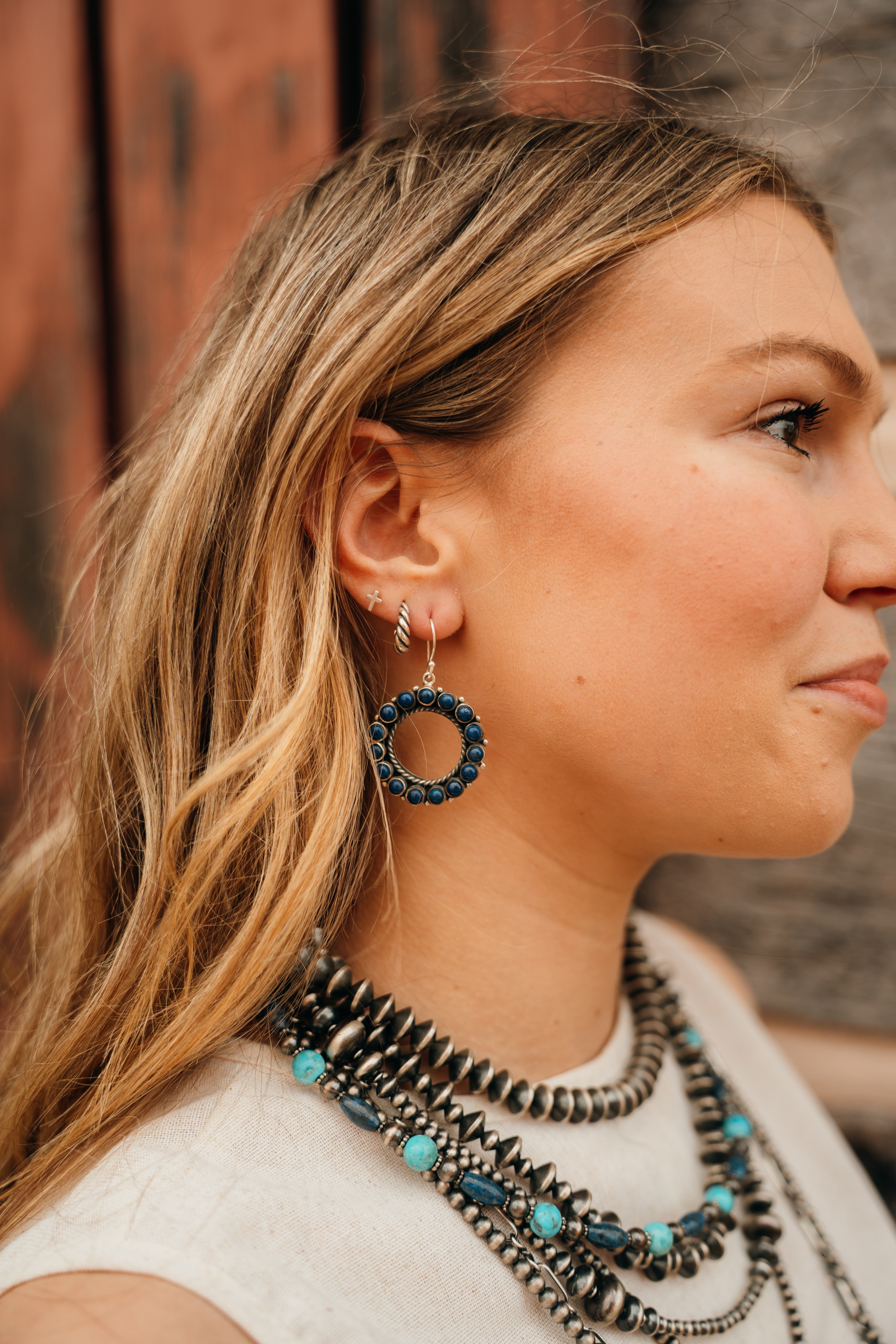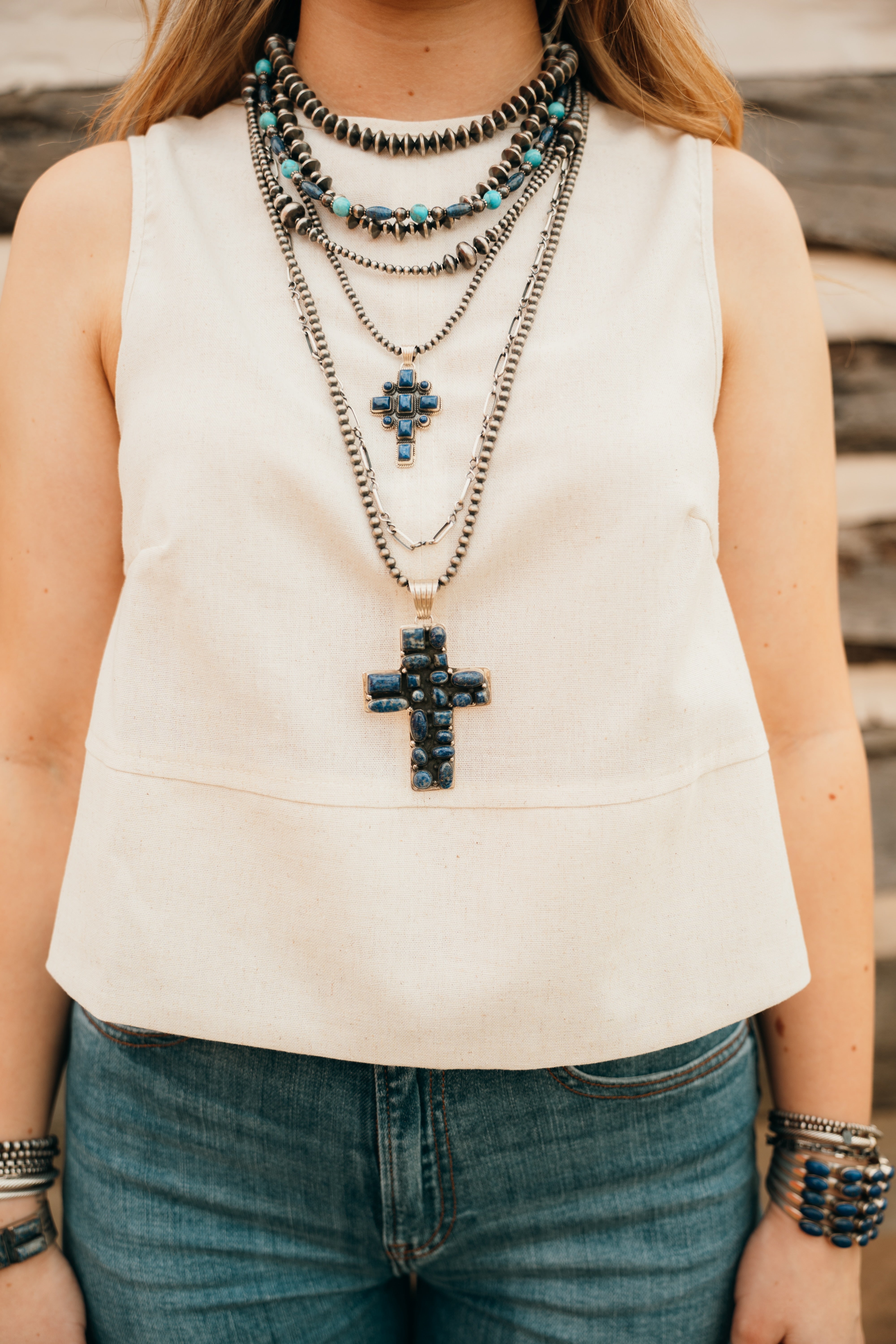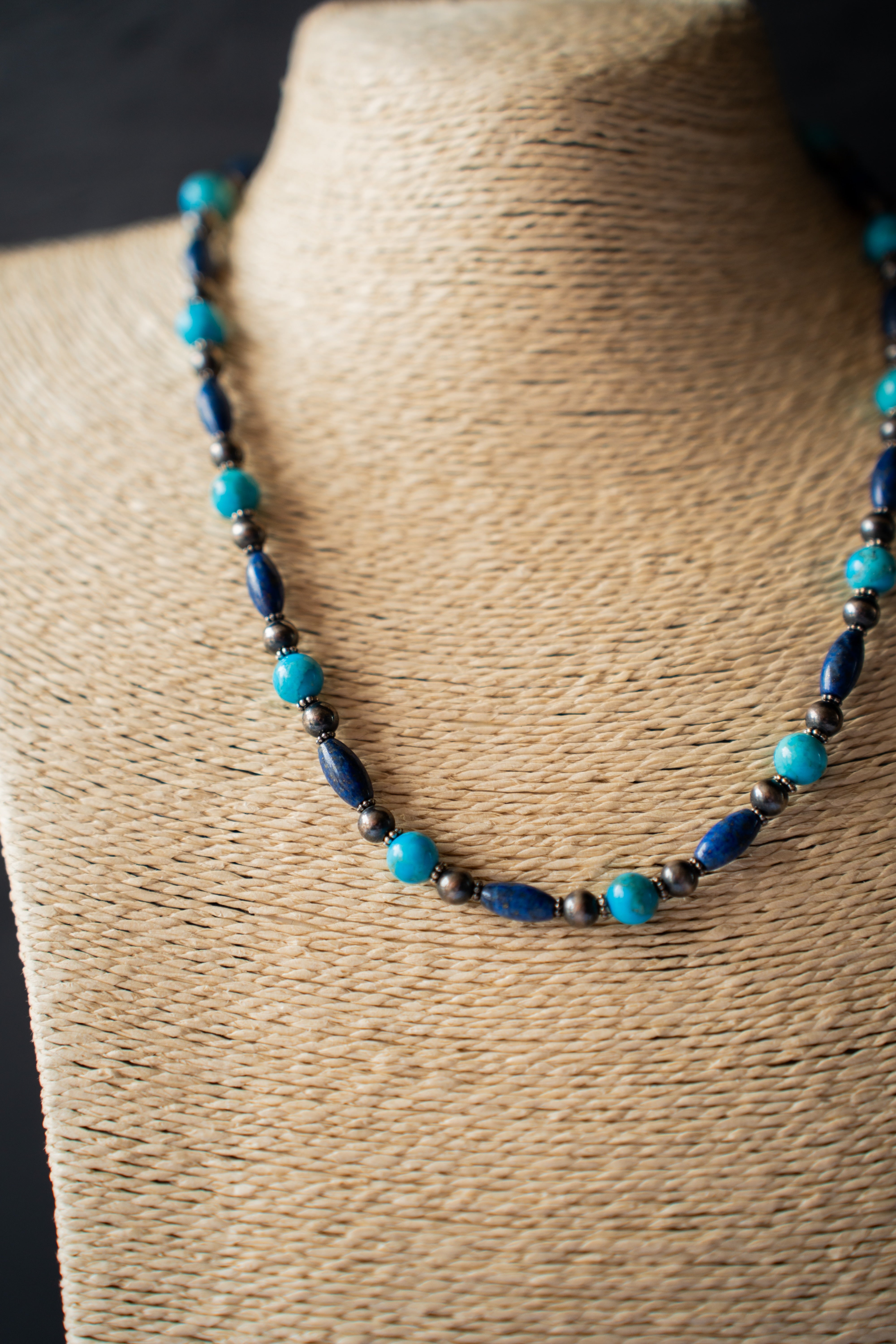 Lapis, turquoise, and navajo pearl necklace. 20-22" in length. Third necklace down in stack.