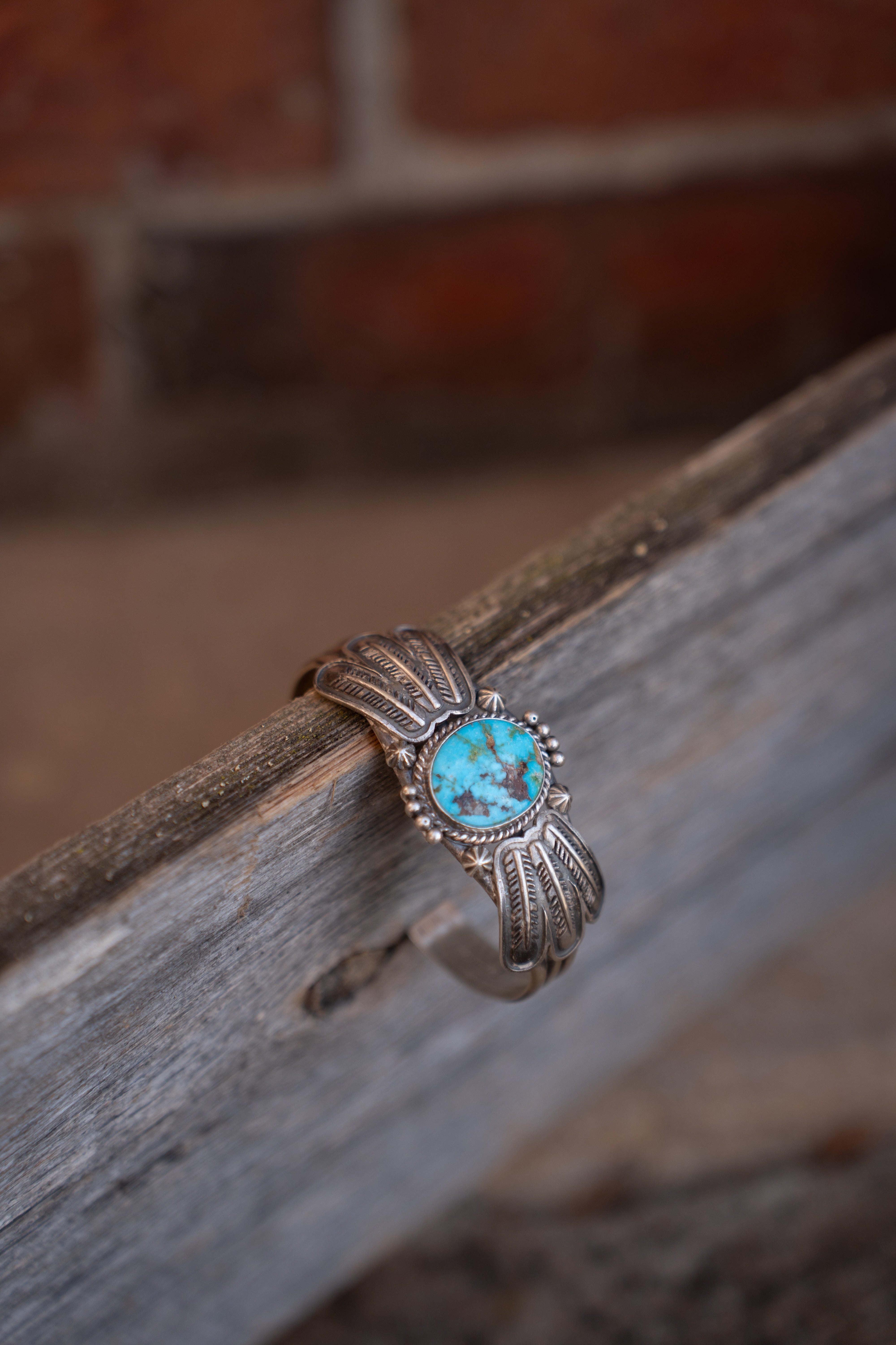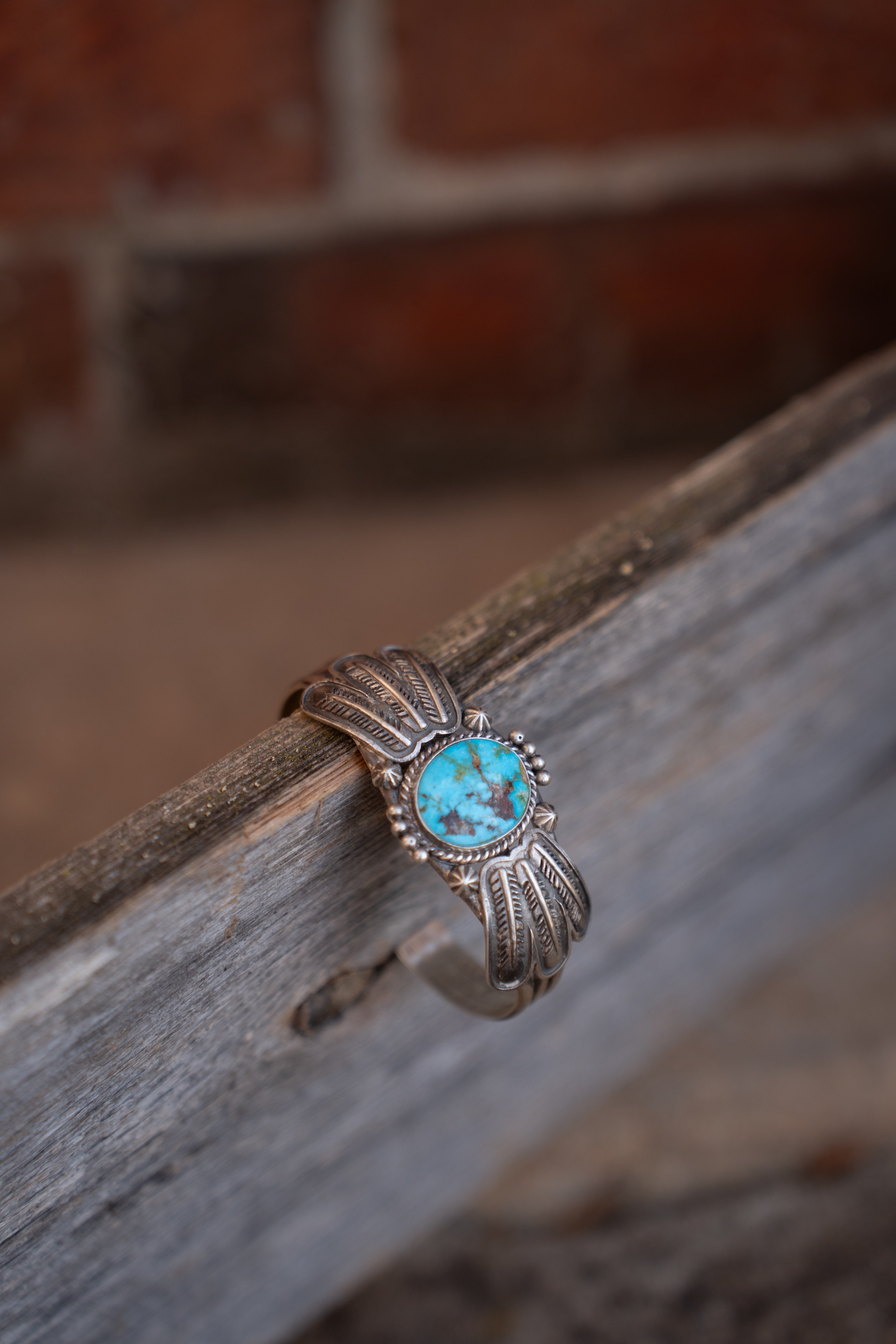 Kingman Turquoise Cuff with feather silver-work.