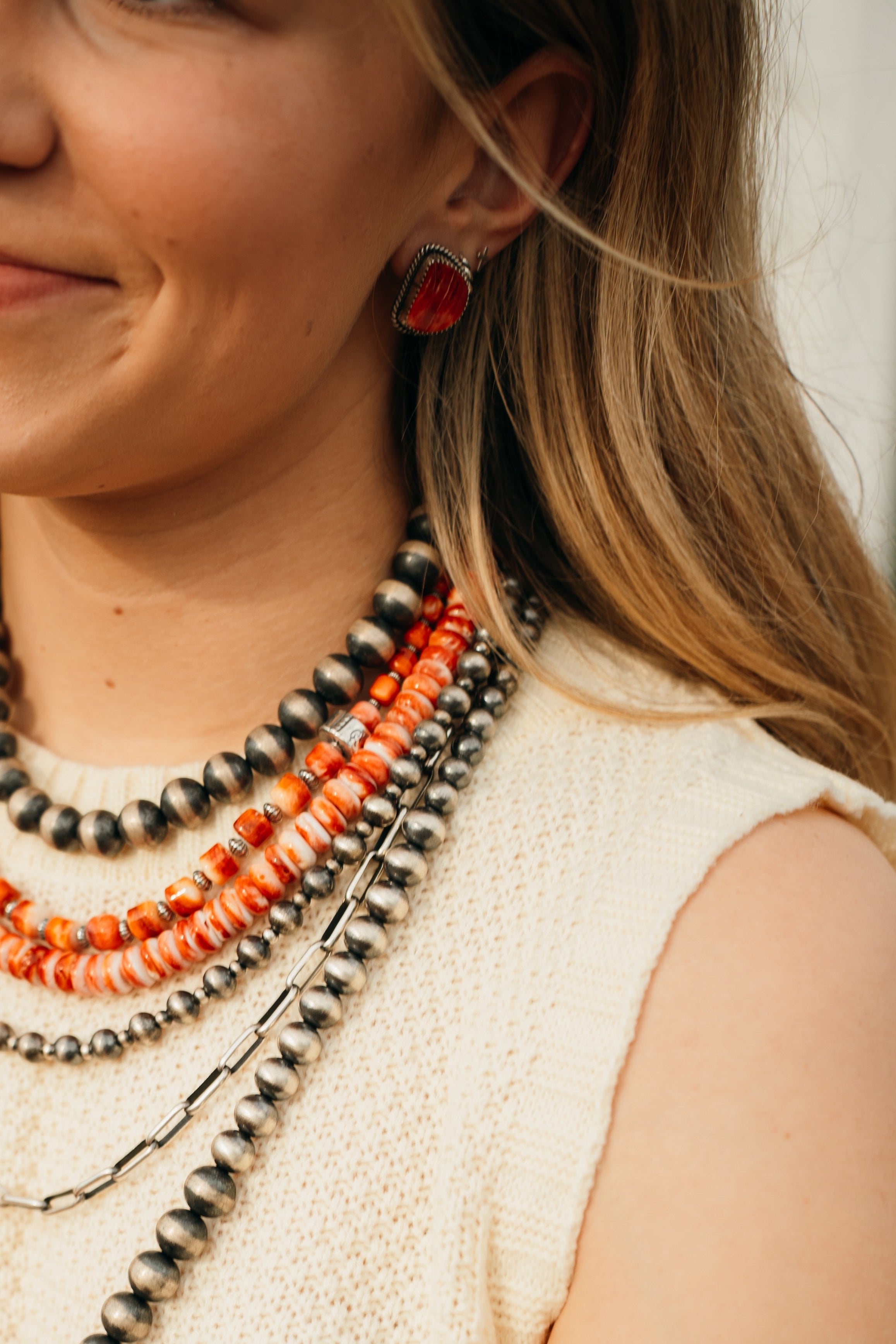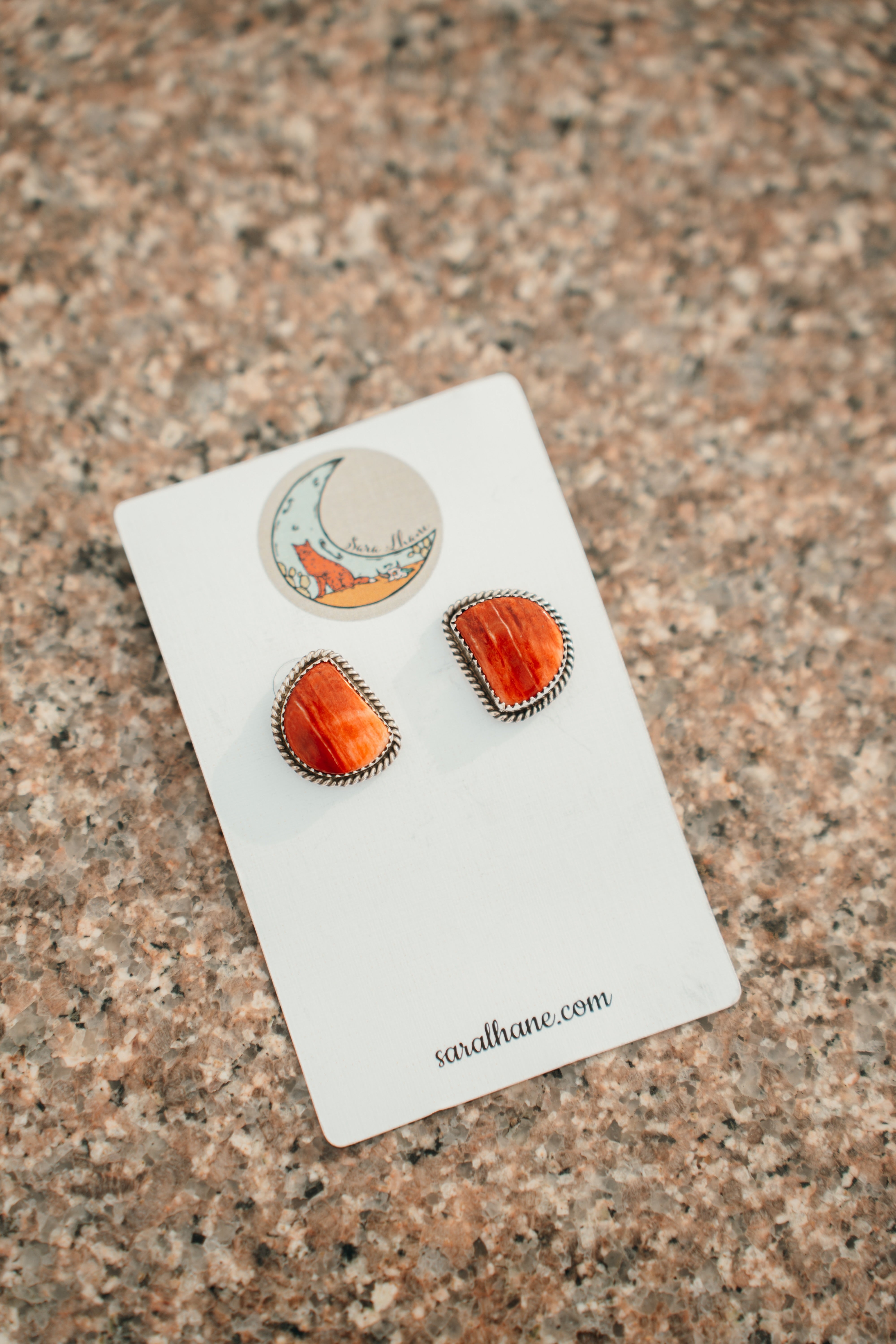 Red spiny oyster and sterling silver studs. Stamped sterling silver and by Theresa Smith. Measures 0.75" x 0.60".