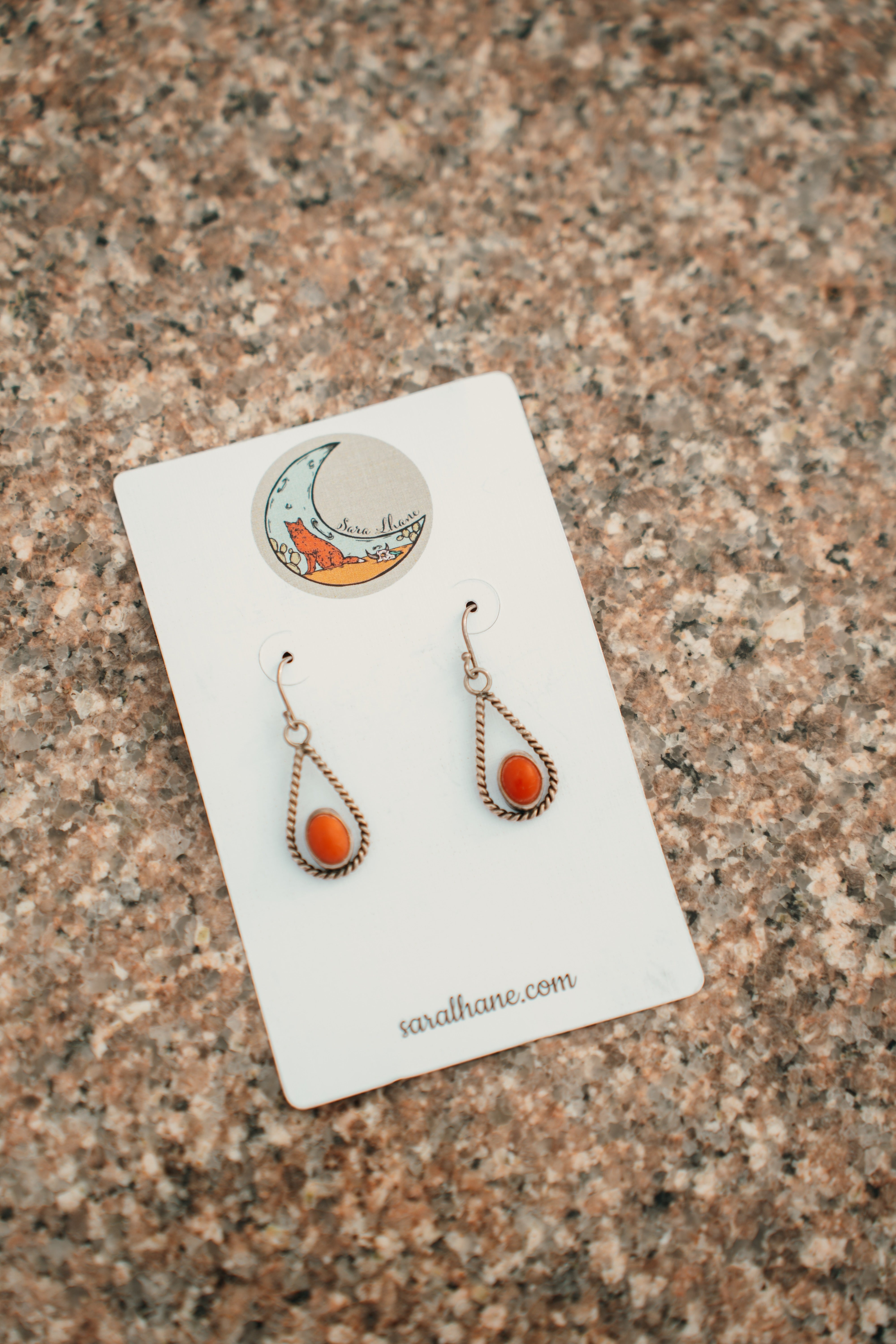 Coral dangle teardrop earrings. Measures 1.25" long.