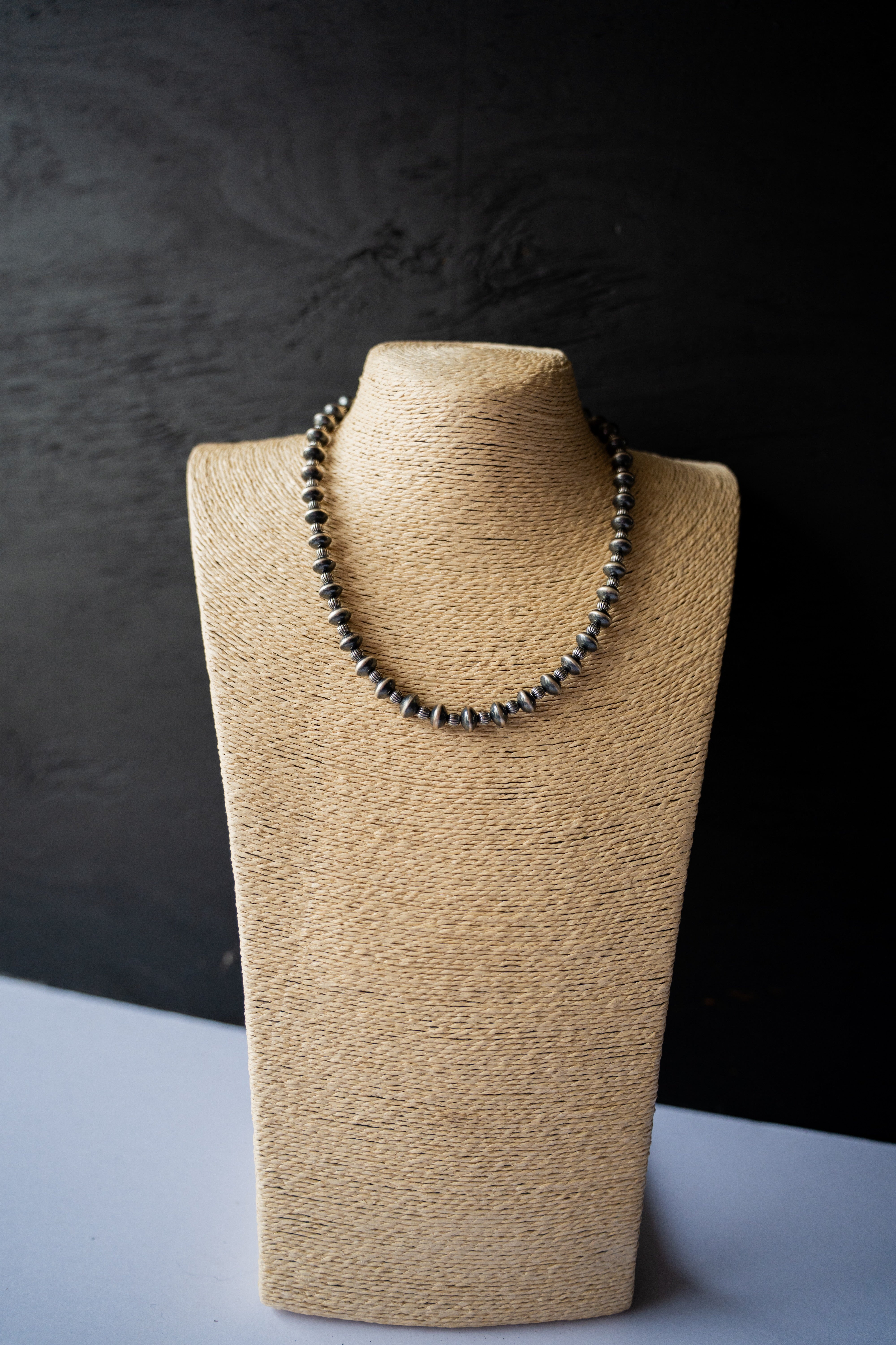 Navajo pearl saucer and corrugated pearl bead necklace. Measures 16-18" in length. First necklace down in stack.