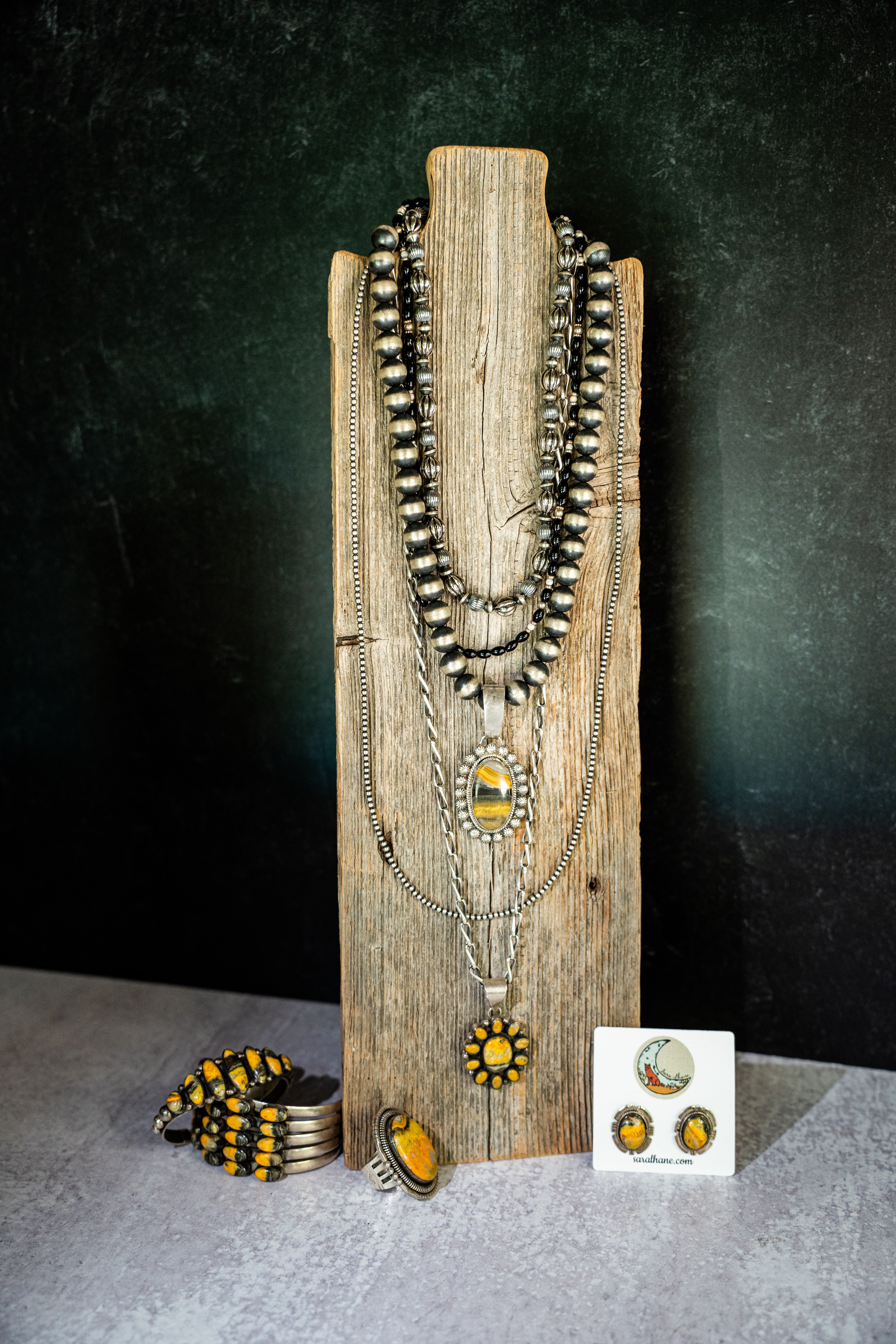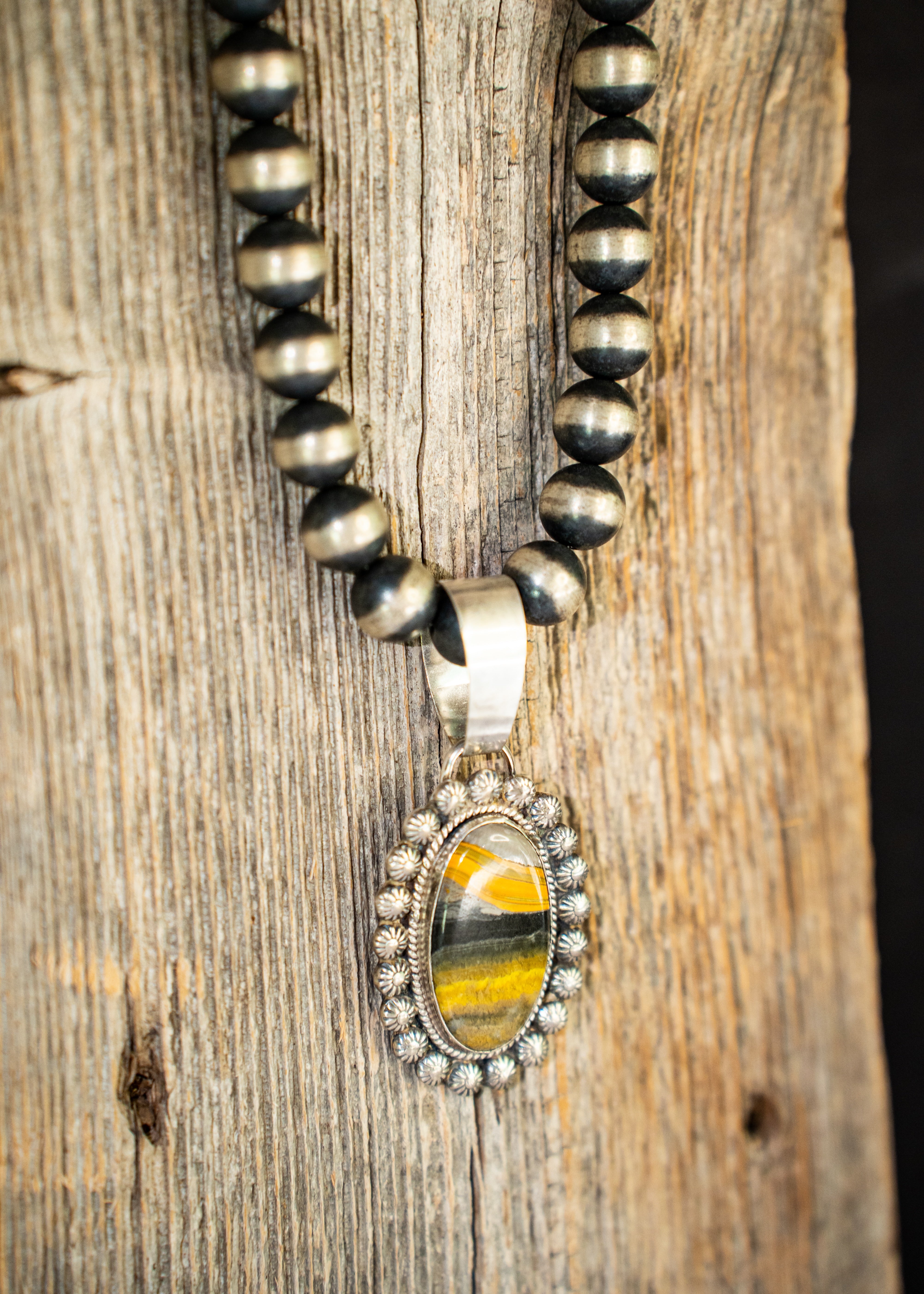 Bumblebee Jasper Pendant. Sterling silver and stamped turquoise mustang. First pendant down in pictures.